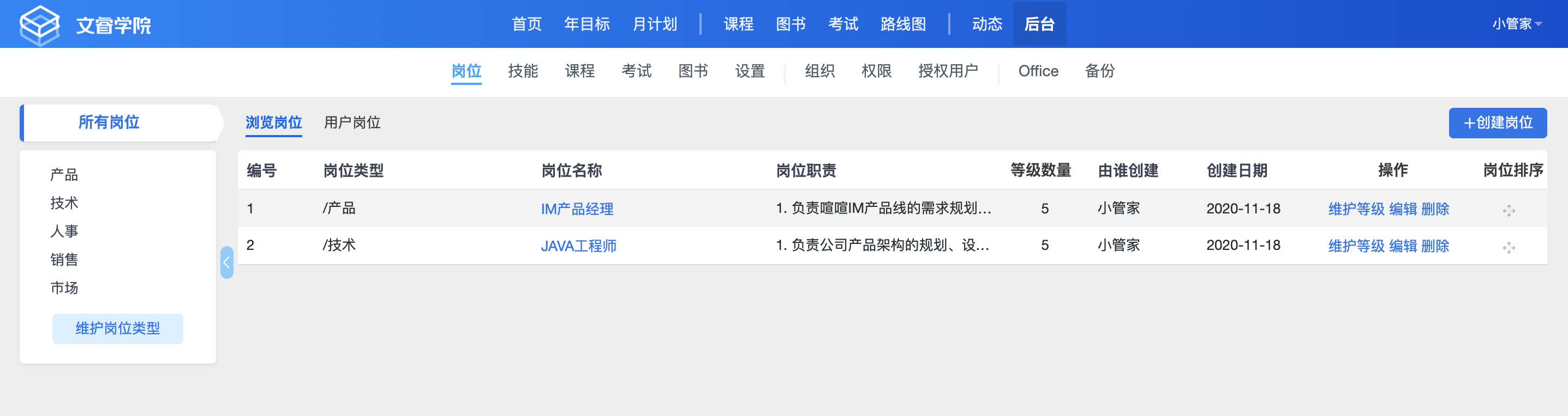管理员可以在岗位管理中对员工进行定岗定级、维护公司所有的岗位职级、不同岗位的晋级要求、相关技能以及等级描述等。
