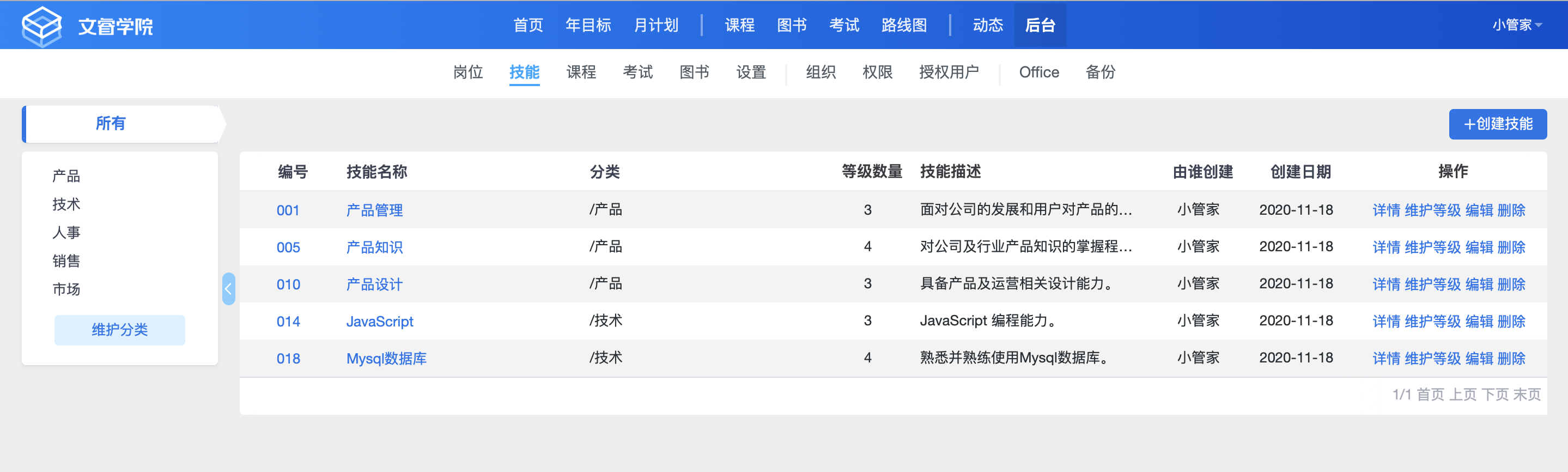 技能:技能是企业发展需要具备的能力,一个技能有不同的等级和要求,它可以与岗位、课程和图书进行关联,让每一位员工清晰的知道自己当前应该具备的技能,以及提升技能需要学习的知识。