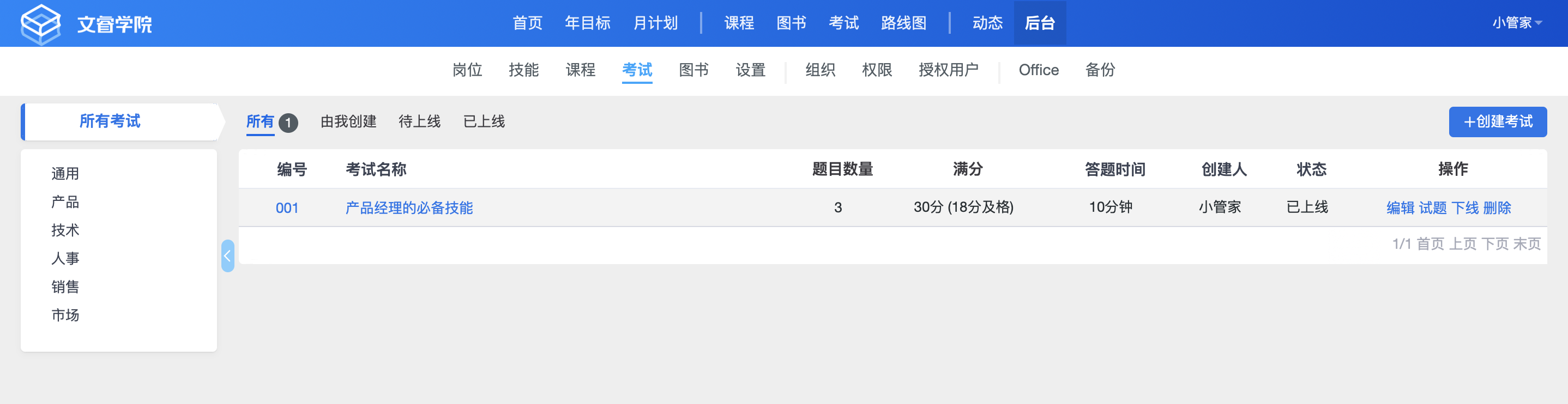 考试可以是通用的考试(全员参与)、也可制定关联具体的课程或具体的岗位等级。