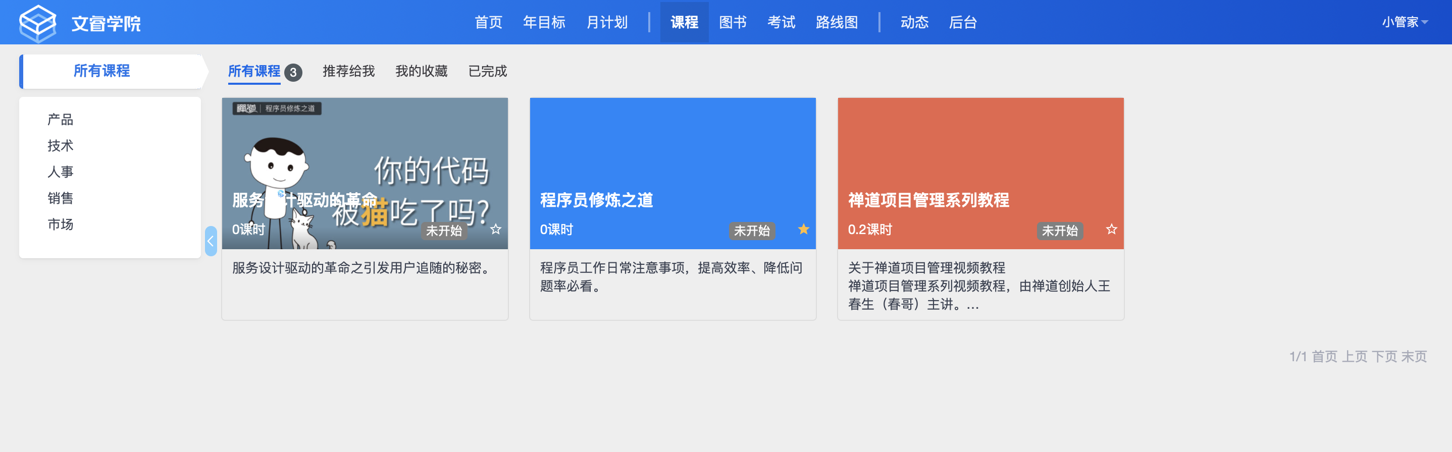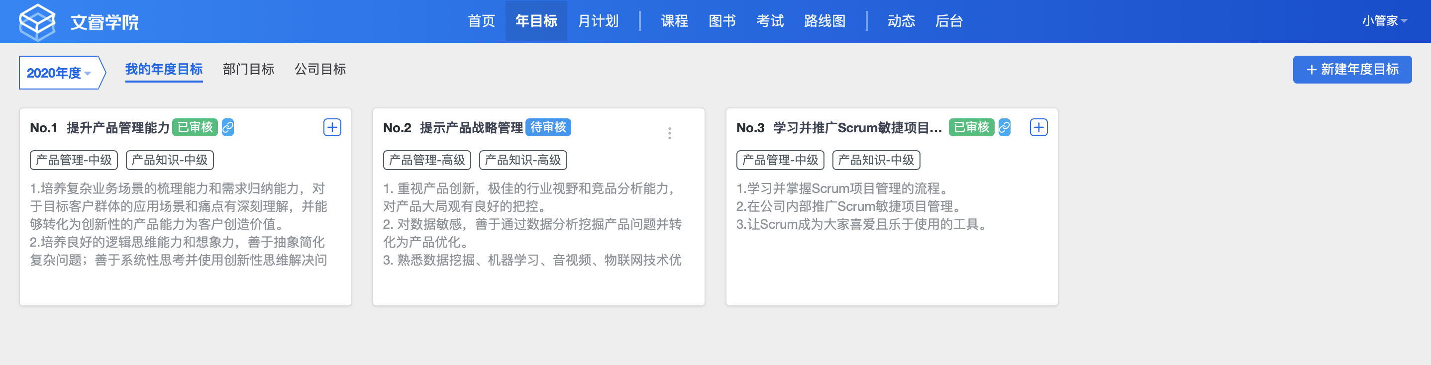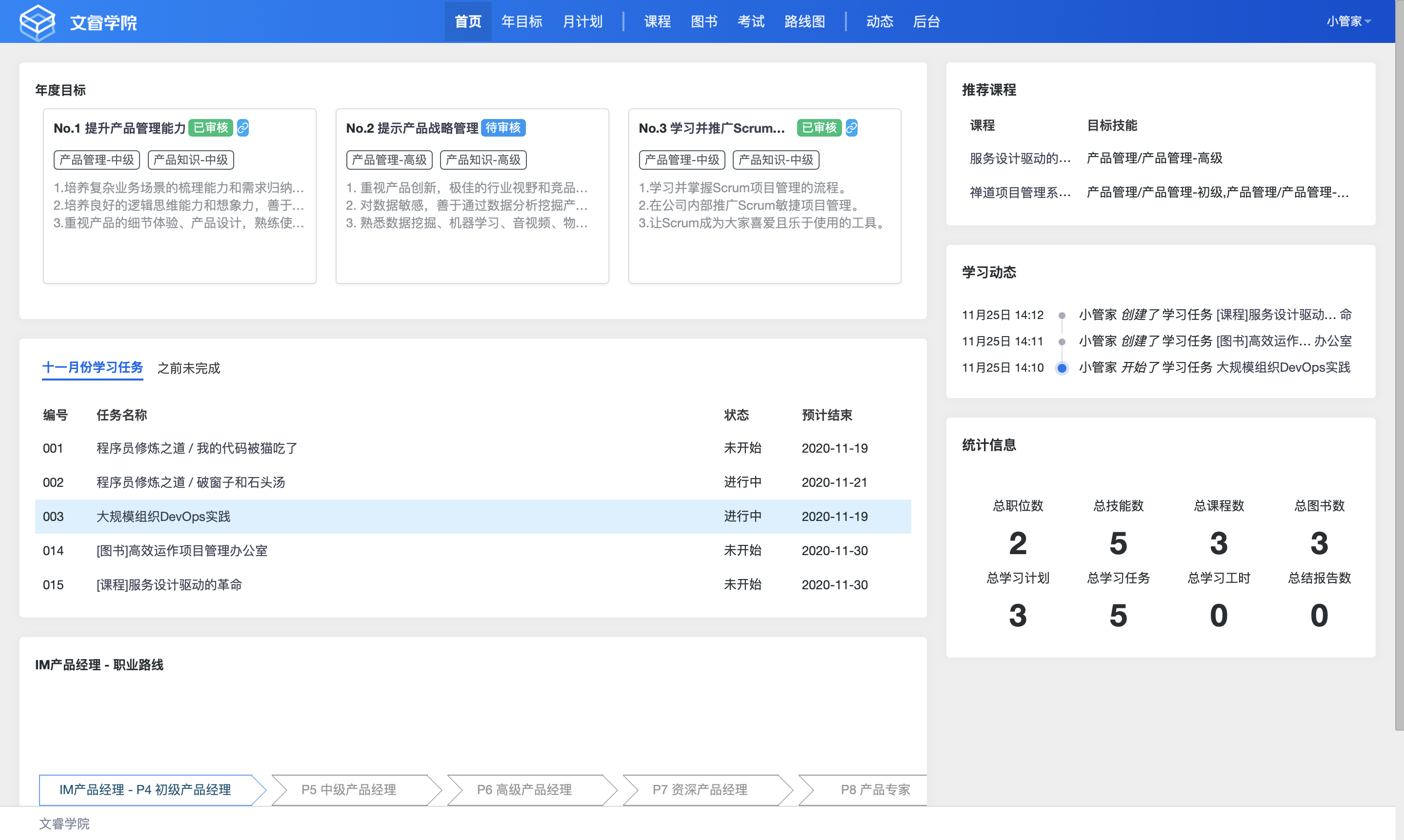 以区块的方式向员工展示他的年度目标、月度学习任务、职业路线、推荐课程、学习动态等信息。