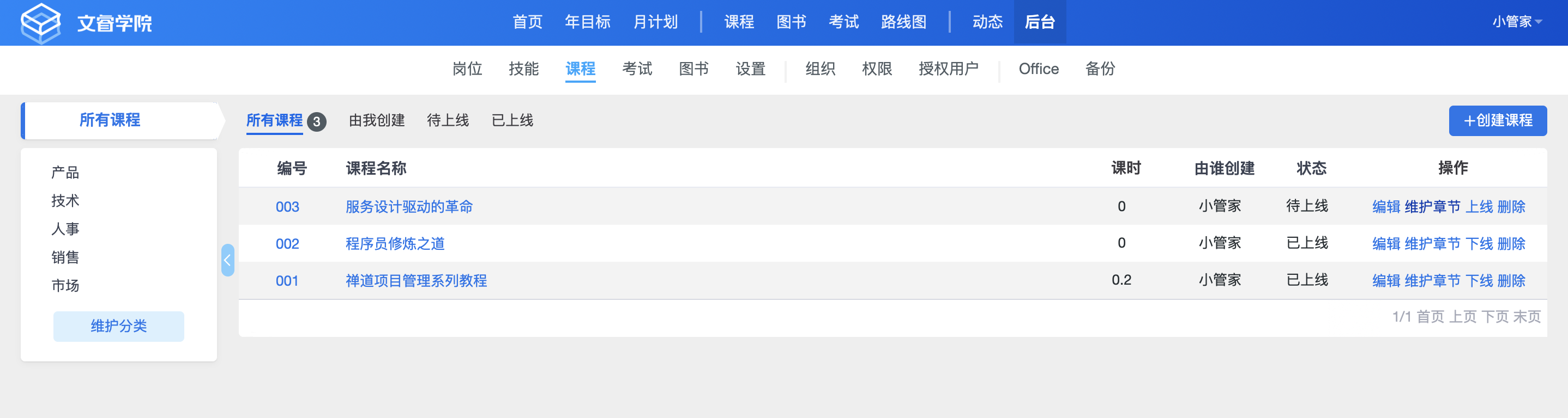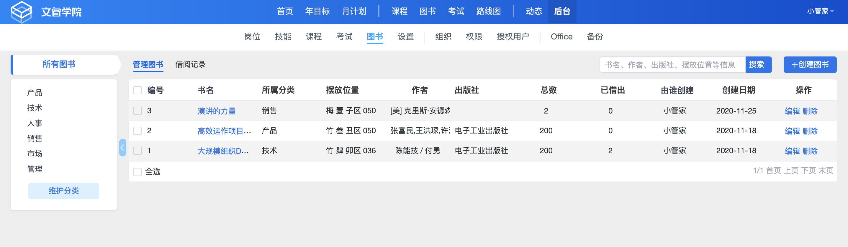 1. 面向管理员的后台,主要包括:岗位管理、技能管理、课程管理、图书管理、考试管理、设置,以及组织、权限、备份等系统设置。