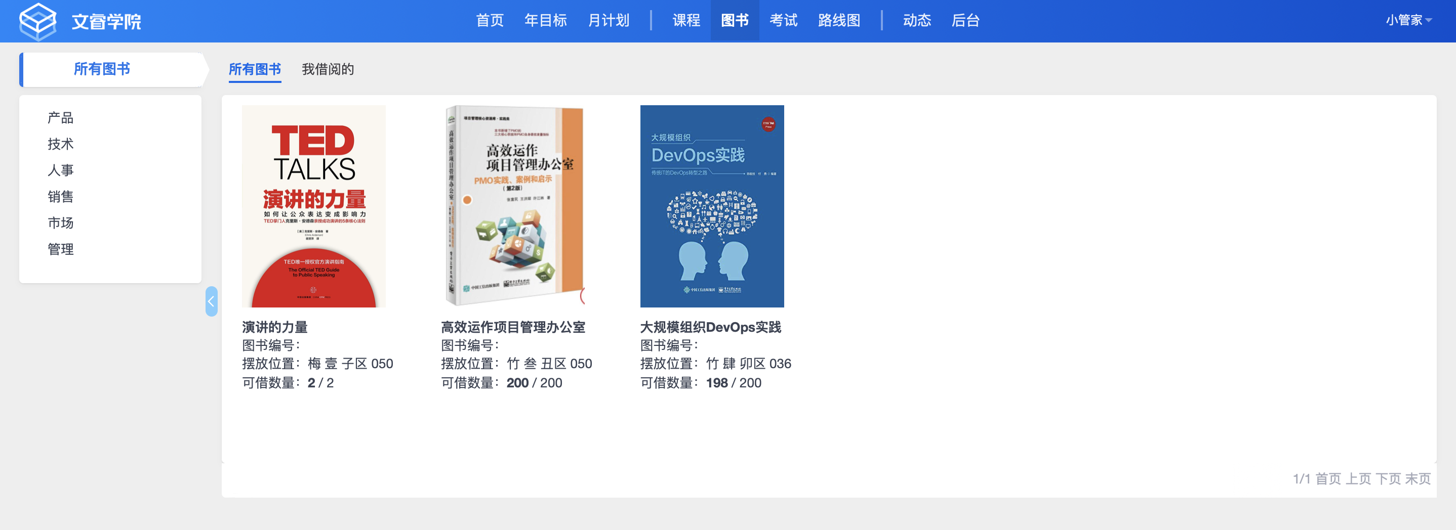 文睿学院主要分为岗位、技能、年目标、月计划、课程、图书、考试等七大板块,管理者通过后台可以设置完善的岗位体系、所需技能以及学习资源等,同时给每一位员工定岗定级。员工通过岗位体系可以清晰的知道自己职业的发展路线,然后根据公司业务发展或职位晋升的方向制定年度学习目标,最后将年目标拆分成一个个具体可执行的学习任务(课程、图书)。