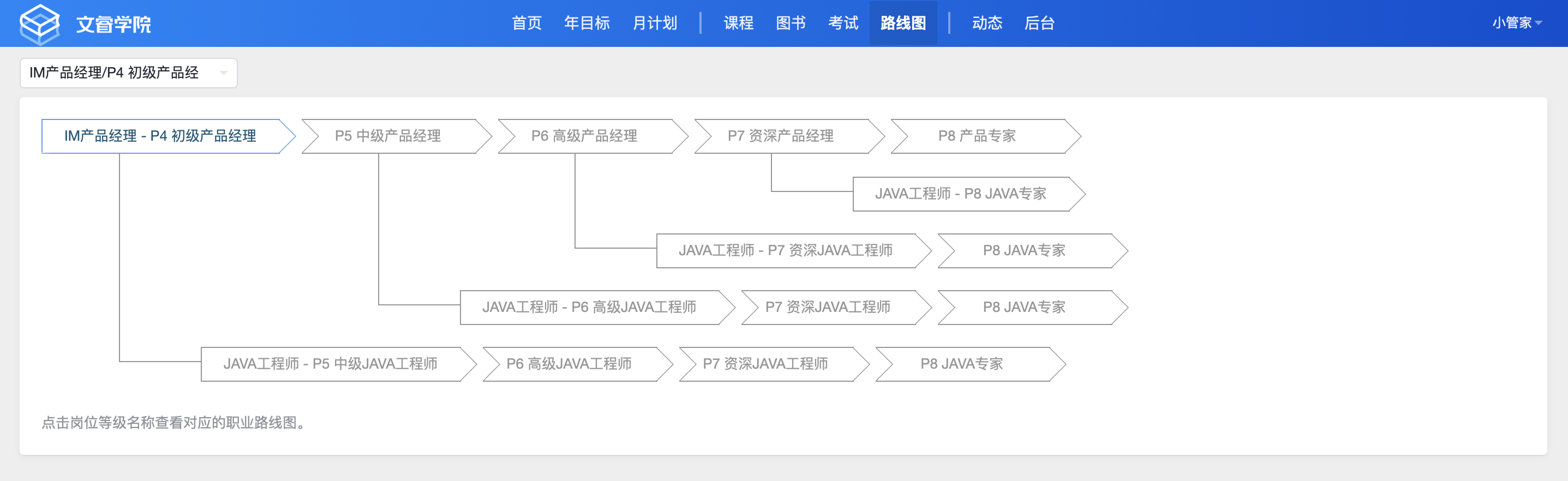 员工可以查看到自己当前的岗位职级和该岗位后续的职业发展路线,以及可转岗到其他岗位的职业发展路线。